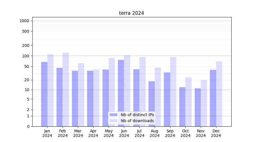 Number of downloads for experiment package terra, year by year, from 2025 back to 2014 (years with no downloads are omitted):