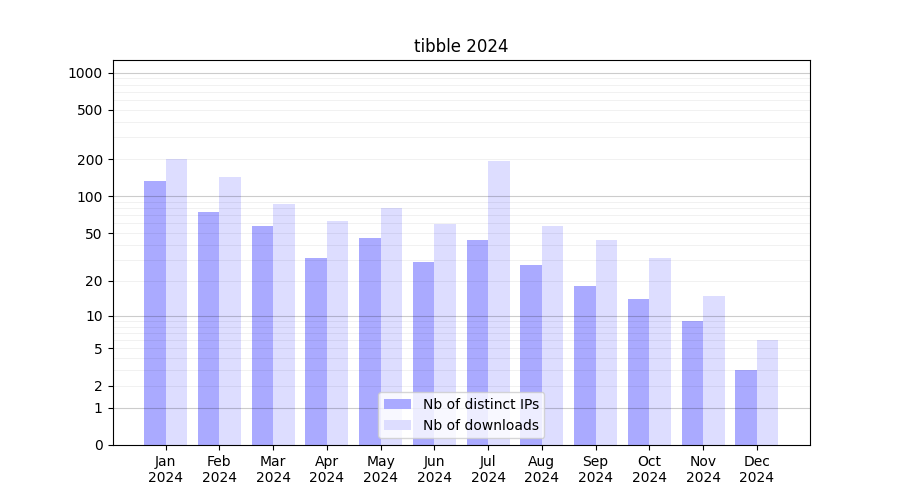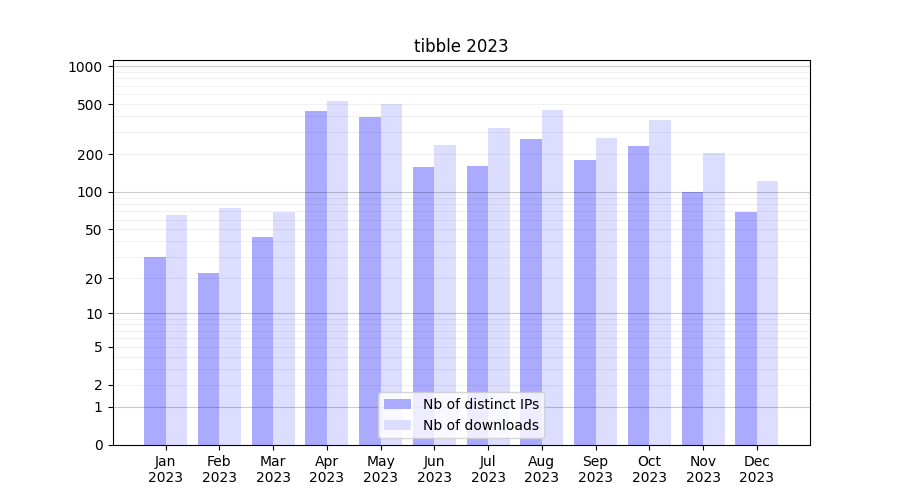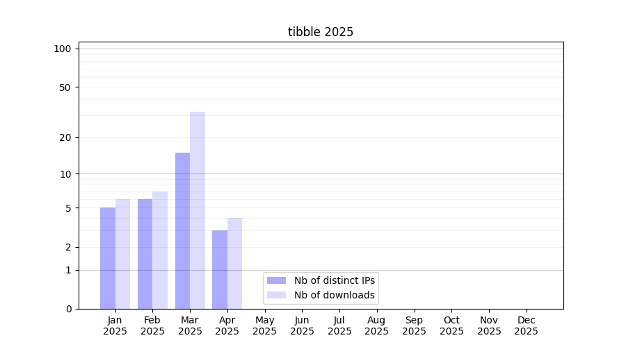Number of downloads for experiment package tibble, year by year, from 2025 back to 2014 (years with no downloads are omitted):
