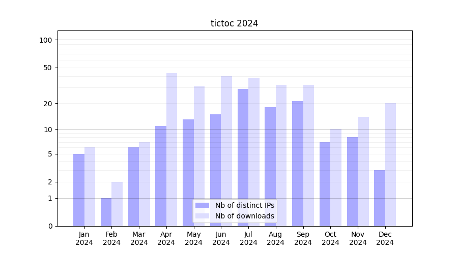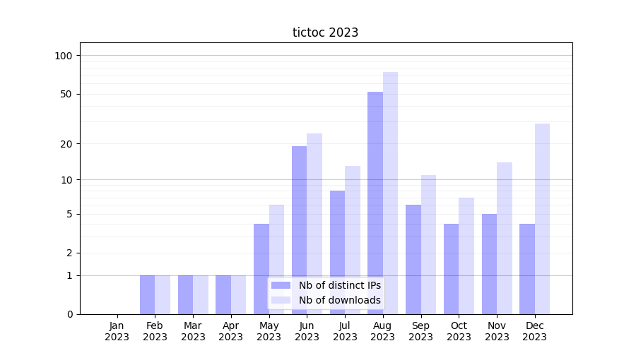 Number of downloads for experiment package tictoc, year by year, from 2025 back to 2014 (years with no downloads are omitted):