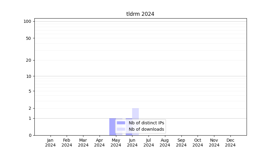 Number of downloads for experiment package tldrm, year by year, from 2025 back to 2014 (years with no downloads are omitted):