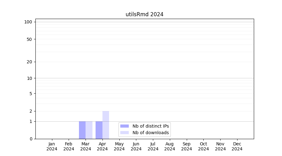 Number of downloads for experiment package utilsRmd, year by year, from 2025 back to 2014 (years with no downloads are omitted):