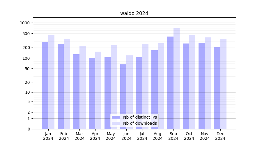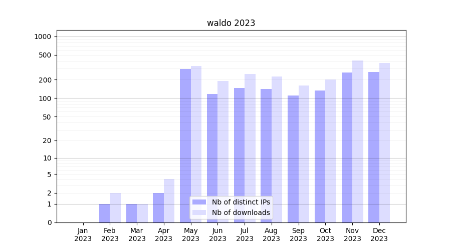 Number of downloads for experiment package waldo, year by year, from 2025 back to 2014 (years with no downloads are omitted):