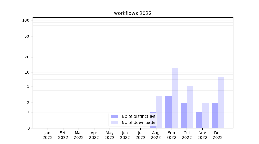 Number of downloads for experiment package workflows, year by year, from 2025 back to 2014 (years with no downloads are omitted):