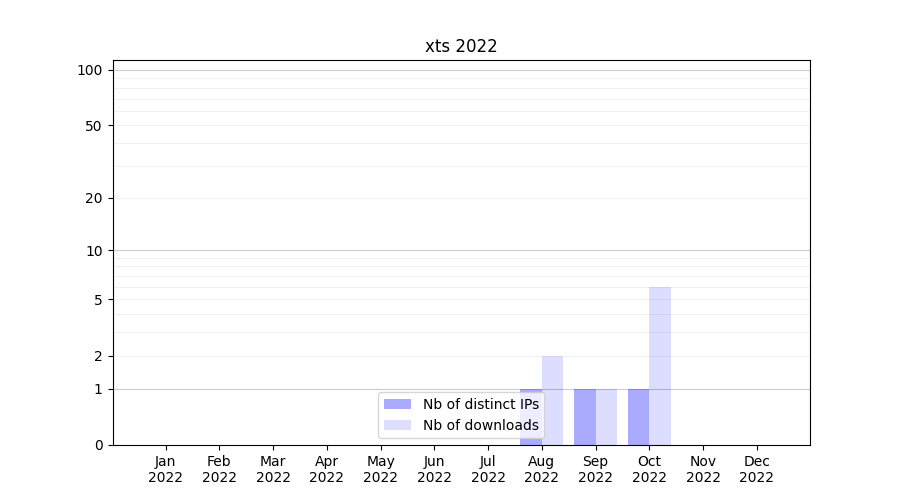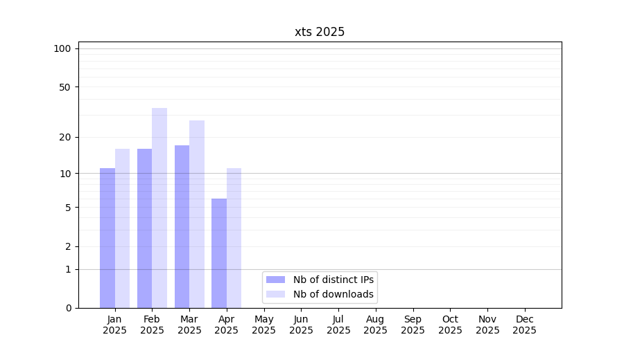 Number of downloads for experiment package xts, year by year, from 2025 back to 2014 (years with no downloads are omitted):