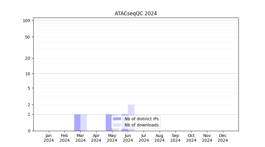 Number of downloads for workflow package ATACseqQC, year by year, from 2025 back to 2015 (years with no downloads are omitted):