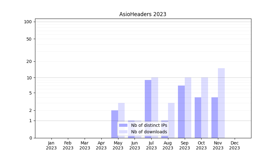 Number of downloads for workflow package AsioHeaders, year by year, from 2025 back to 2015 (years with no downloads are omitted):