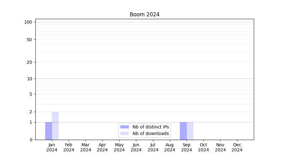 Number of downloads for workflow package Boom, year by year, from 2025 back to 2015 (years with no downloads are omitted):