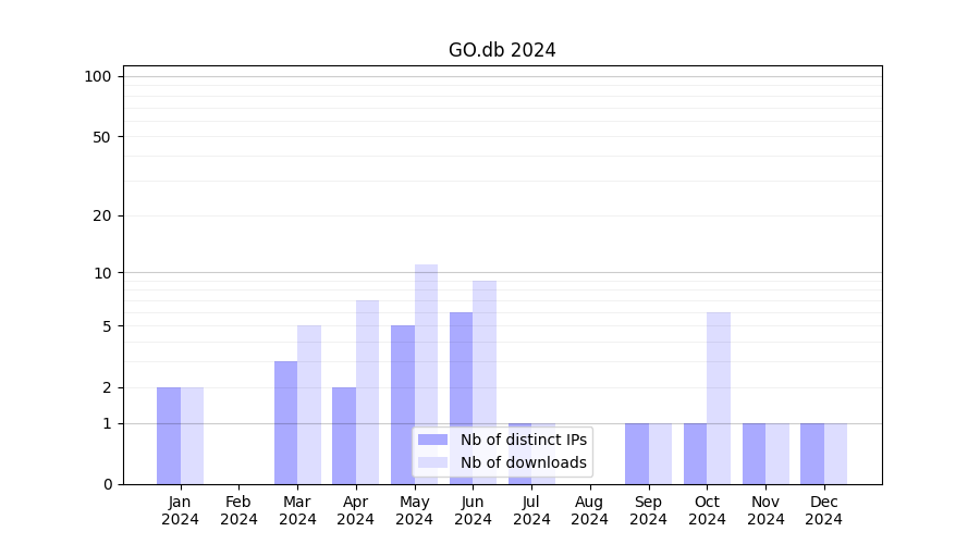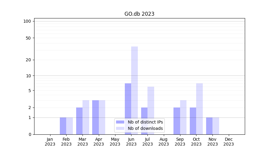 Number of downloads for workflow package GO.db, year by year, from 2025 back to 2015 (years with no downloads are omitted):