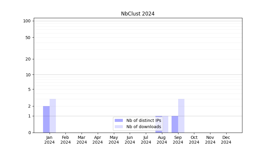 Number of downloads for workflow package NbClust, year by year, from 2025 back to 2015 (years with no downloads are omitted):