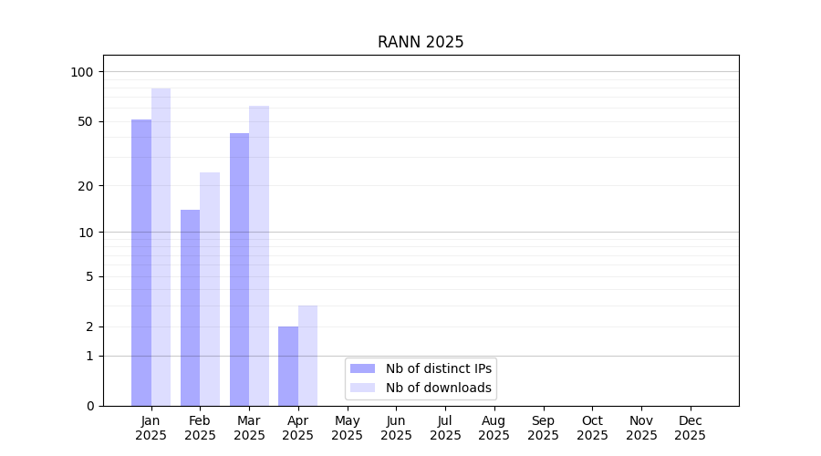 Number of downloads for workflow package RANN, year by year, from 2025 back to 2015 (years with no downloads are omitted):