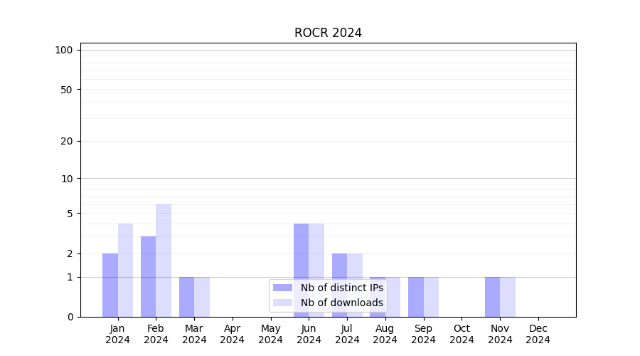Number of downloads for workflow package ROCR, year by year, from 2025 back to 2015 (years with no downloads are omitted):