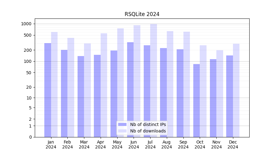 Number of downloads for workflow package RSQLite, year by year, from 2025 back to 2015 (years with no downloads are omitted):