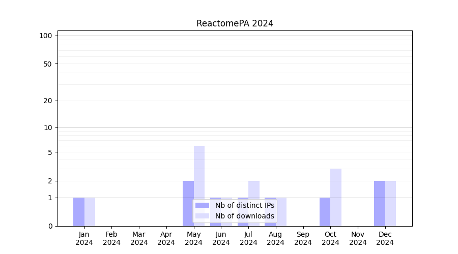 Number of downloads for workflow package ReactomePA, year by year, from 2025 back to 2015 (years with no downloads are omitted):