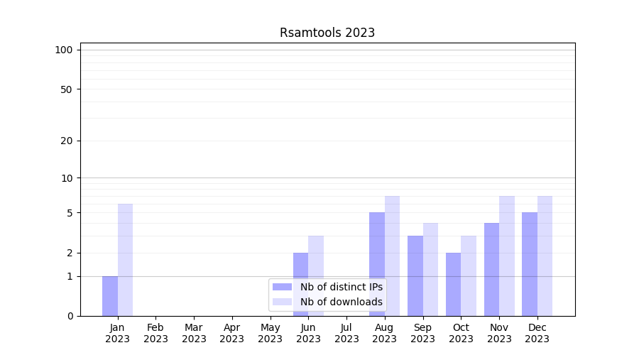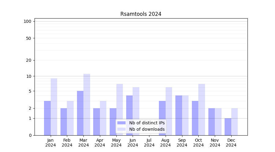 Number of downloads for workflow package Rsamtools, year by year, from 2025 back to 2015 (years with no downloads are omitted):