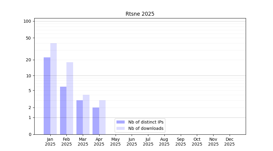 Number of downloads for workflow package Rtsne, year by year, from 2025 back to 2015 (years with no downloads are omitted):