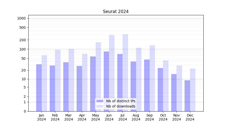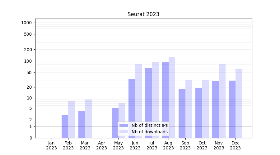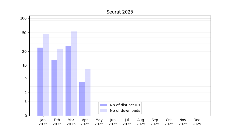 Number of downloads for workflow package Seurat, year by year, from 2025 back to 2015 (years with no downloads are omitted):