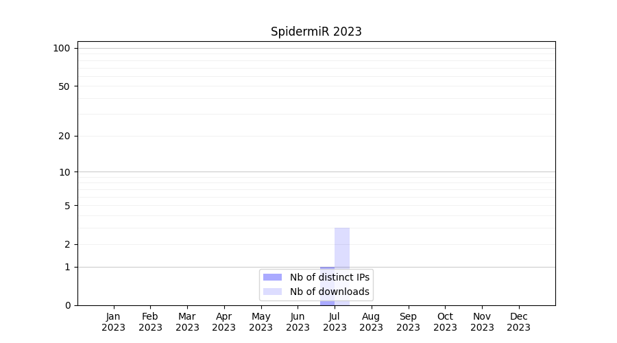 Number of downloads for workflow package SpidermiR, year by year, from 2025 back to 2015 (years with no downloads are omitted):