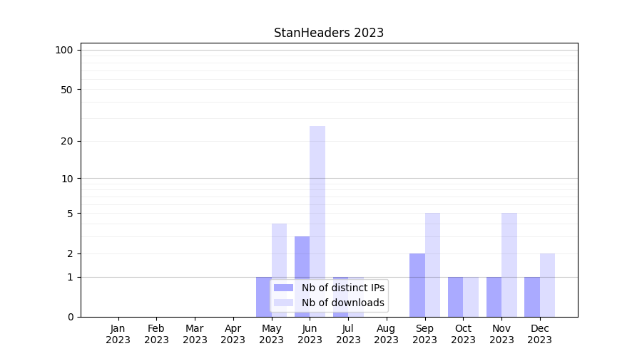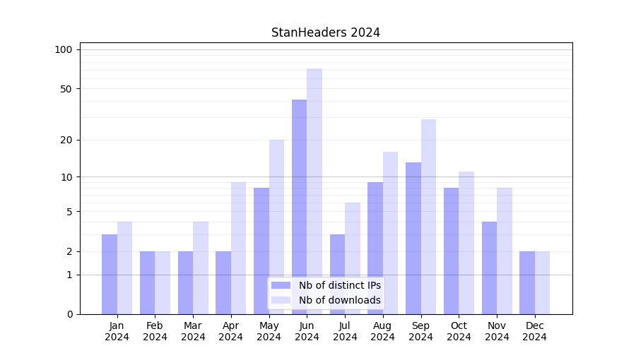 Number of downloads for workflow package StanHeaders, year by year, from 2025 back to 2015 (years with no downloads are omitted):