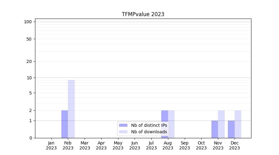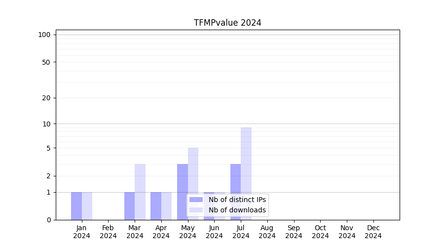 Number of downloads for workflow package TFMPvalue, year by year, from 2025 back to 2015 (years with no downloads are omitted):