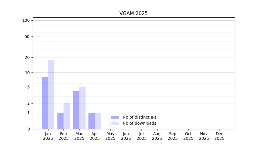 Number of downloads for workflow package VGAM, year by year, from 2025 back to 2015 (years with no downloads are omitted):