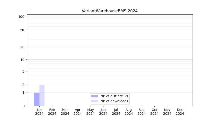 Number of downloads for workflow package VariantWarehouseBMS, year by year, from 2025 back to 2015 (years with no downloads are omitted):