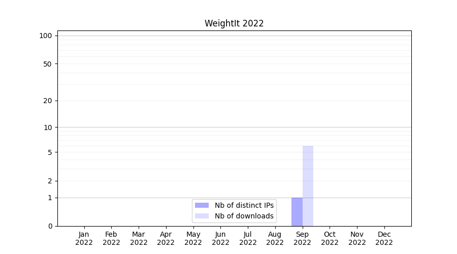 Number of downloads for workflow package WeightIt, year by year, from 2025 back to 2015 (years with no downloads are omitted):