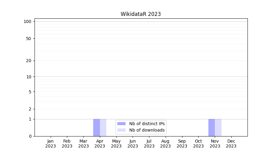 Number of downloads for workflow package WikidataR, year by year, from 2025 back to 2015 (years with no downloads are omitted):