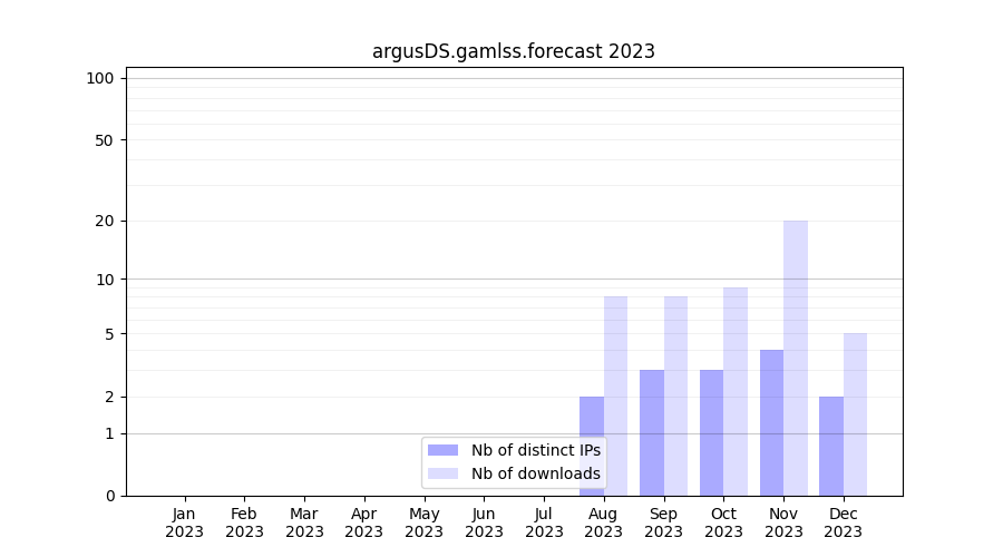 Number of downloads for workflow package argusDS.gamlss.forecast, year by year, from 2025 back to 2015 (years with no downloads are omitted):