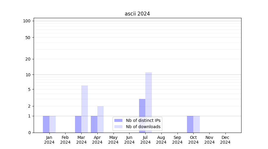 Number of downloads for workflow package ascii, year by year, from 2025 back to 2015 (years with no downloads are omitted):