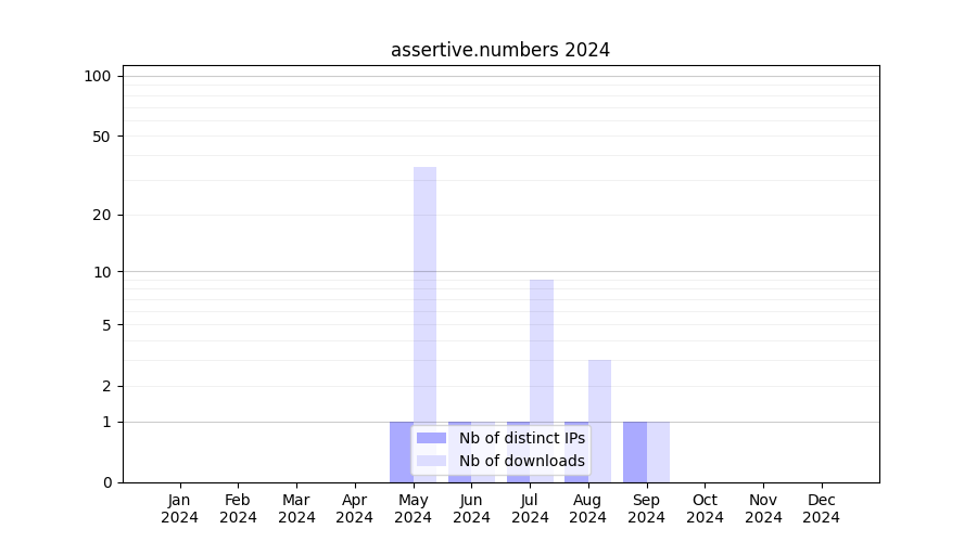 Number of downloads for workflow package assertive.numbers, year by year, from 2025 back to 2015 (years with no downloads are omitted):