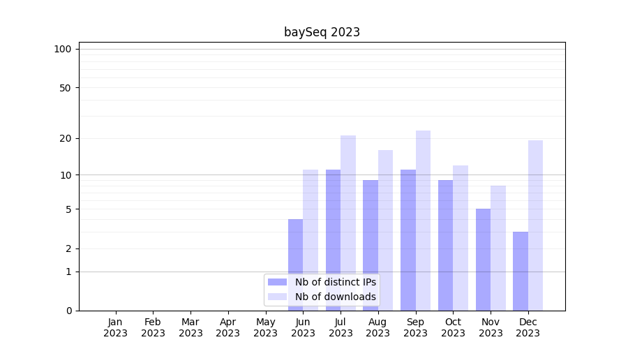 Number of downloads for workflow package baySeq, year by year, from 2025 back to 2015 (years with no downloads are omitted):