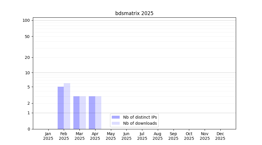 Number of downloads for workflow package bdsmatrix, year by year, from 2025 back to 2015 (years with no downloads are omitted):