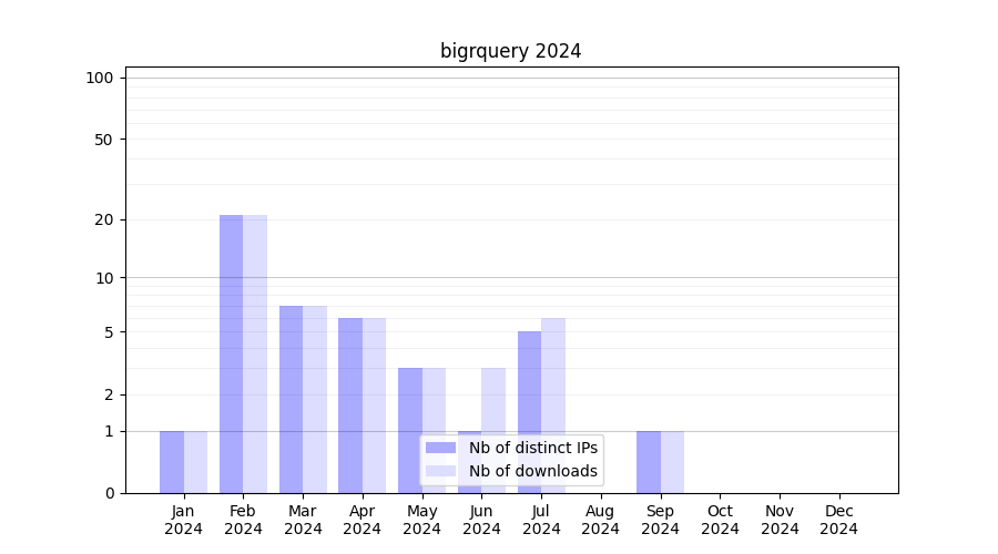 Number of downloads for workflow package bigrquery, year by year, from 2025 back to 2015 (years with no downloads are omitted):