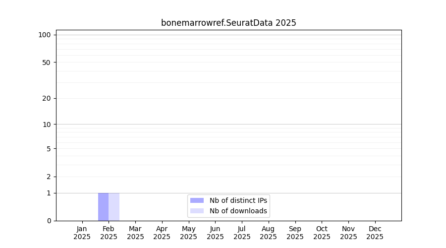 Number of downloads for workflow package bonemarrowref.SeuratData, year by year, from 2025 back to 2015 (years with no downloads are omitted):