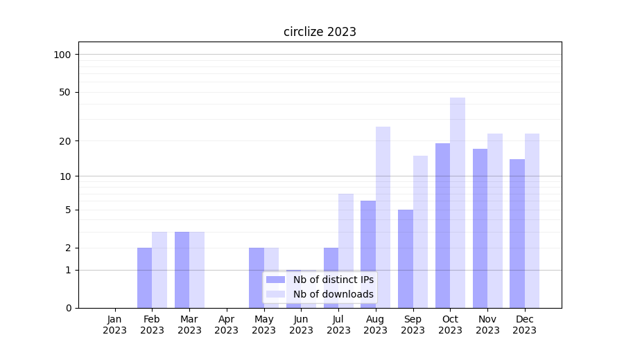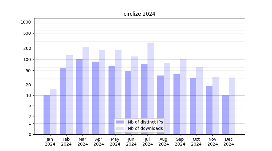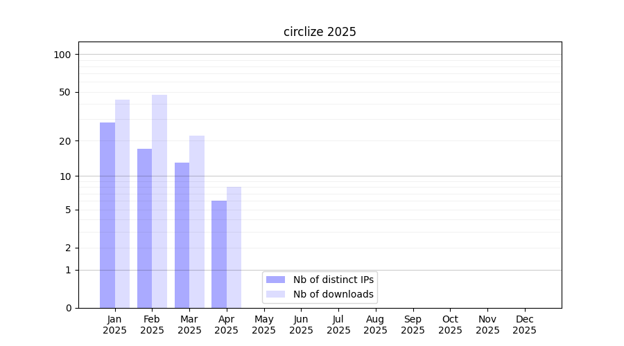 Number of downloads for workflow package circlize, year by year, from 2025 back to 2015 (years with no downloads are omitted):