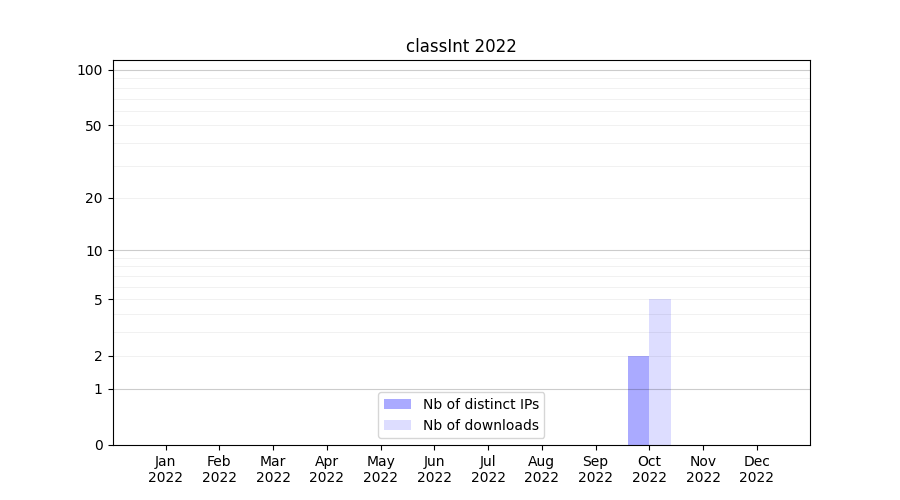 Number of downloads for workflow package classInt, year by year, from 2025 back to 2015 (years with no downloads are omitted):