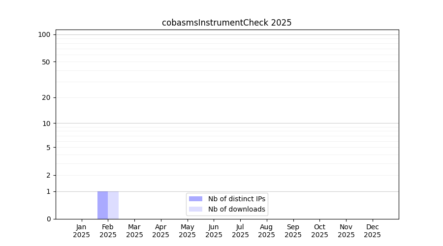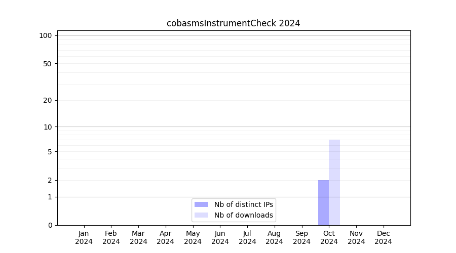 Number of downloads for workflow package cobasmsInstrumentCheck, year by year, from 2025 back to 2015 (years with no downloads are omitted):
