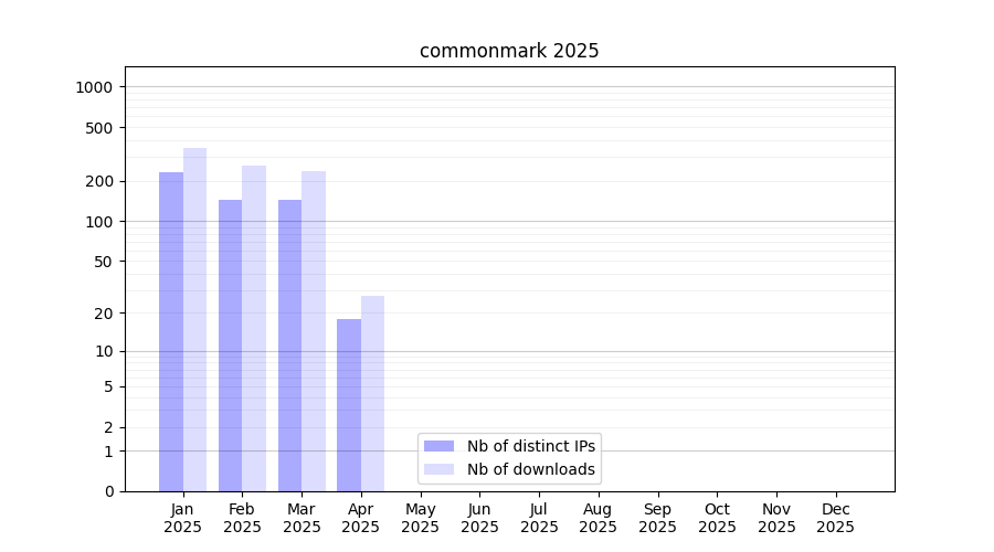 Number of downloads for workflow package commonmark, year by year, from 2025 back to 2015 (years with no downloads are omitted):