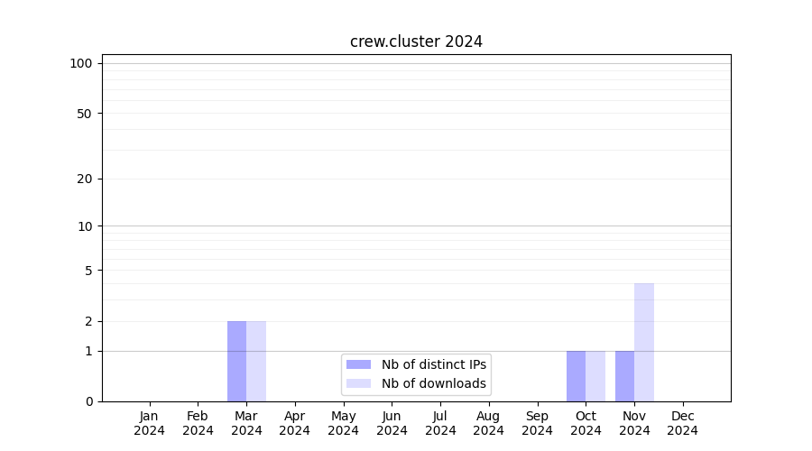 Number of downloads for workflow package crew.cluster, year by year, from 2025 back to 2015 (years with no downloads are omitted):