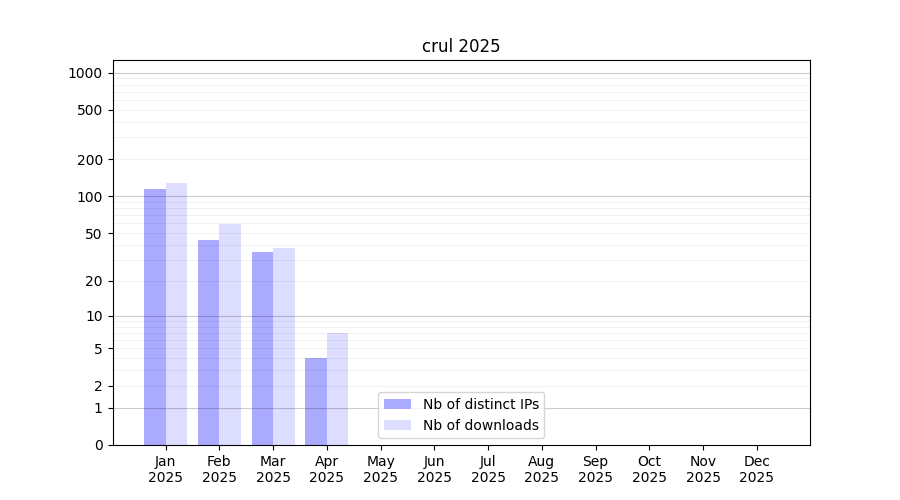 Number of downloads for workflow package crul, year by year, from 2025 back to 2015 (years with no downloads are omitted):