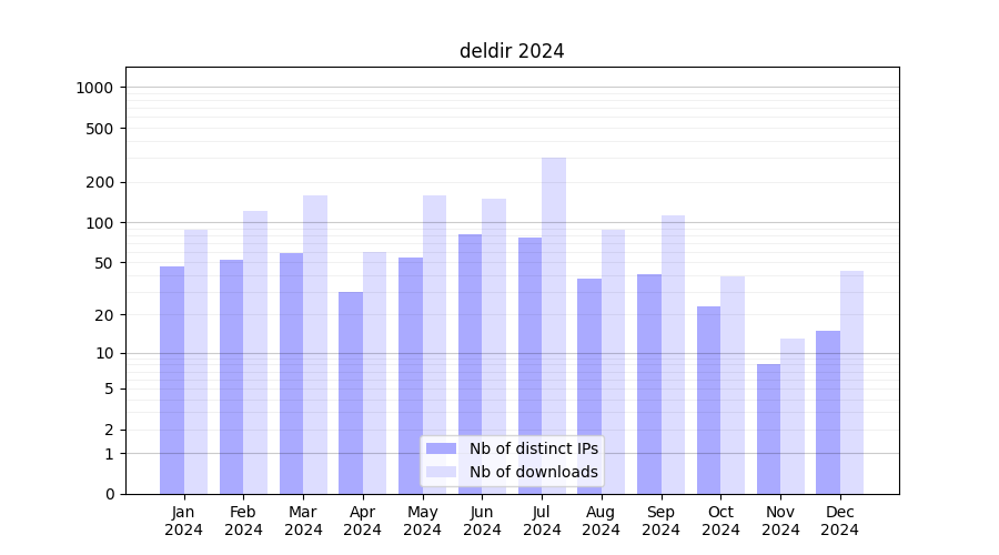 Number of downloads for workflow package deldir, year by year, from 2025 back to 2015 (years with no downloads are omitted):