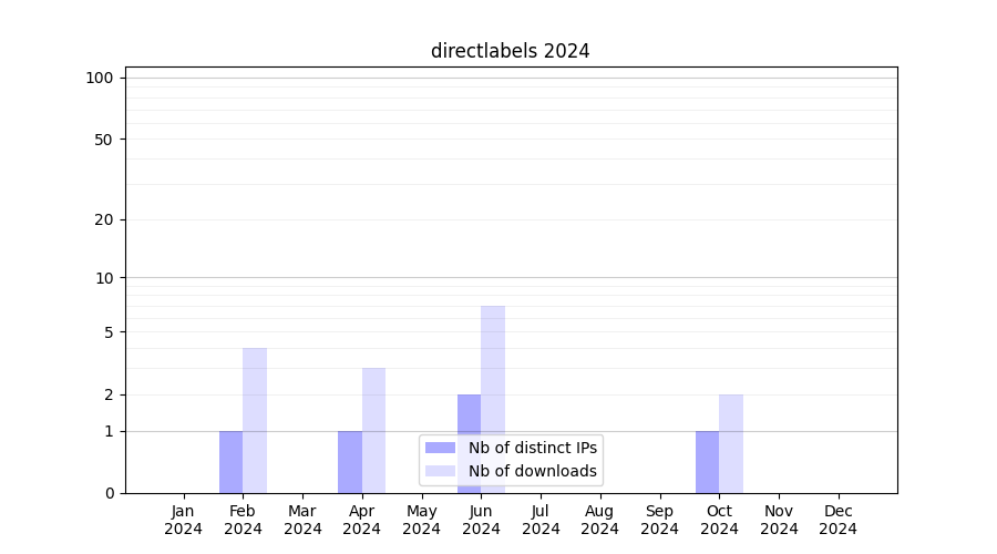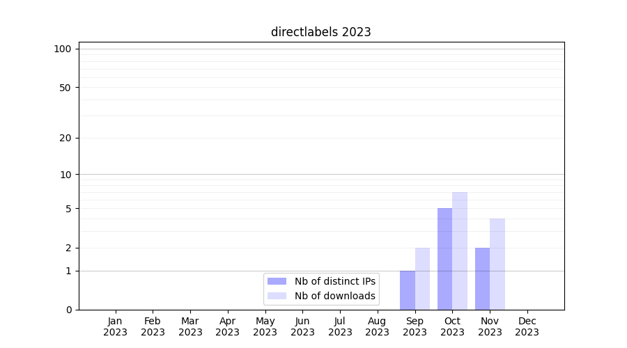 Number of downloads for workflow package directlabels, year by year, from 2025 back to 2015 (years with no downloads are omitted):