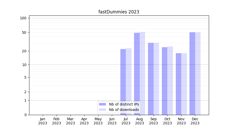 Number of downloads for workflow package fastDummies, year by year, from 2025 back to 2015 (years with no downloads are omitted):