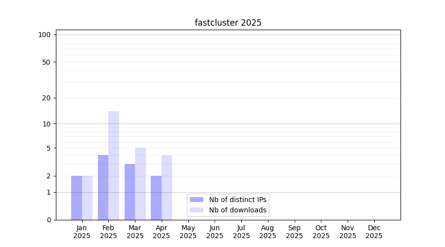 Number of downloads for workflow package fastcluster, year by year, from 2025 back to 2015 (years with no downloads are omitted):