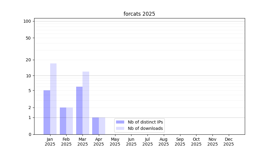 Number of downloads for workflow package forcats, year by year, from 2025 back to 2015 (years with no downloads are omitted):