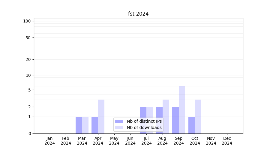 Number of downloads for workflow package fst, year by year, from 2025 back to 2015 (years with no downloads are omitted):