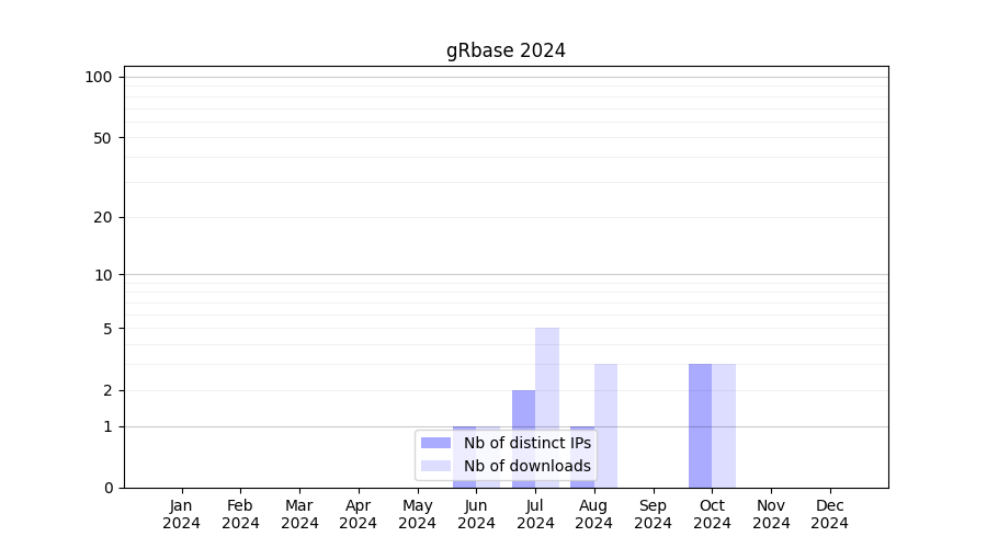 Number of downloads for workflow package gRbase, year by year, from 2025 back to 2015 (years with no downloads are omitted):
