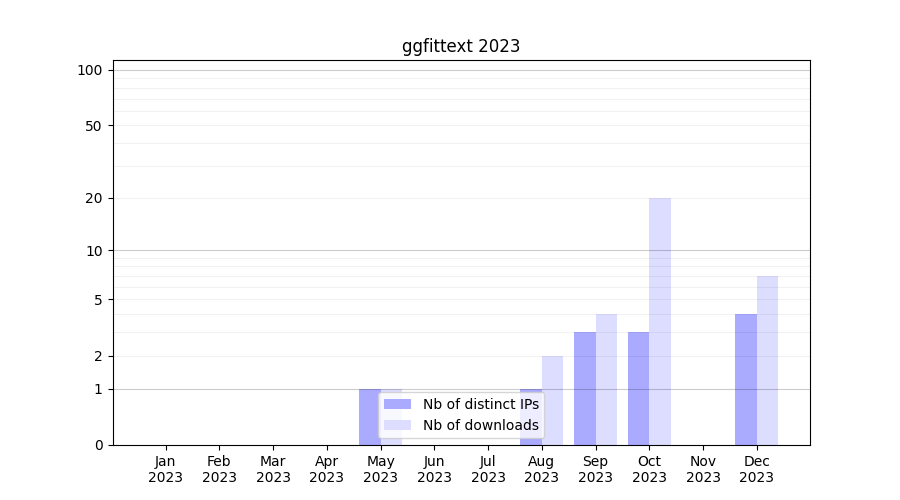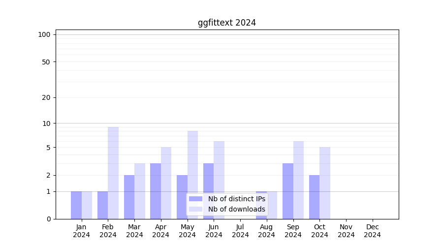 Number of downloads for workflow package ggfittext, year by year, from 2025 back to 2015 (years with no downloads are omitted):