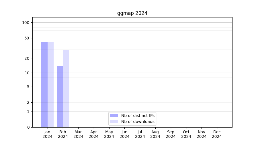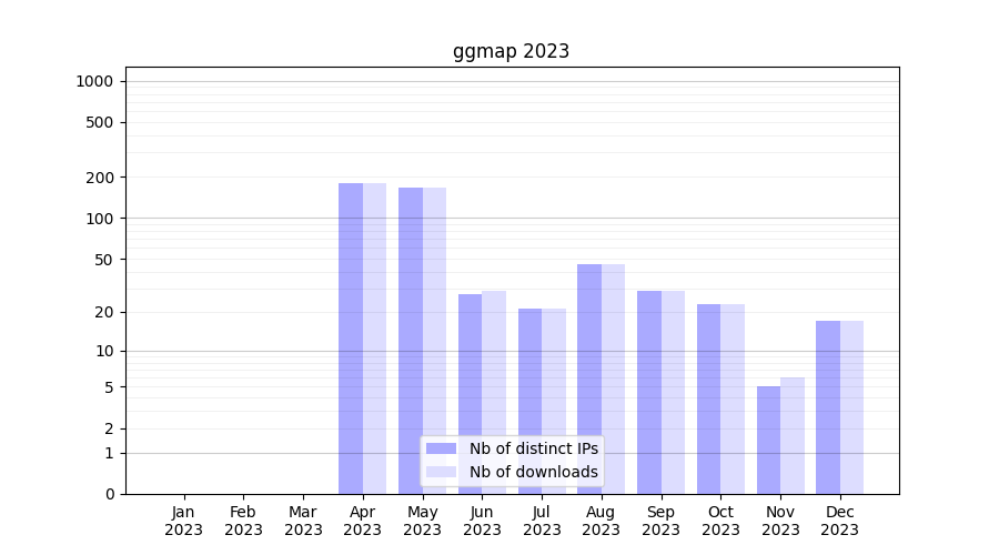 Number of downloads for workflow package ggmap, year by year, from 2025 back to 2015 (years with no downloads are omitted):