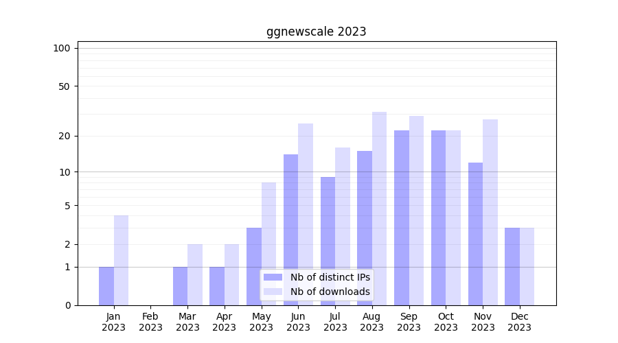 Number of downloads for workflow package ggnewscale, year by year, from 2025 back to 2015 (years with no downloads are omitted):